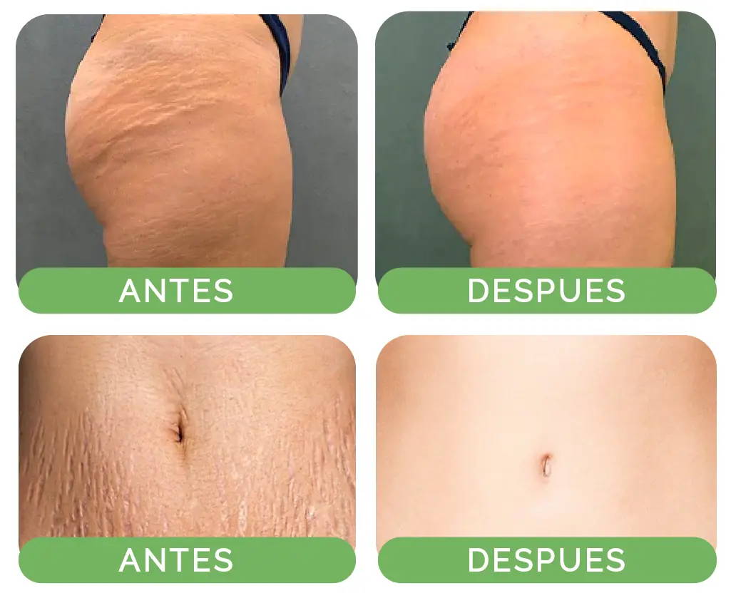 Disfruta de sus increíbles resultados en pocas semanas, utilizado en agencias de modelaje gracias a que logra rápidamente una piel estética y homogénea, regenera el tejido desde la primera aplicación y renueva la piel de las estrías eliminándolas por completo.